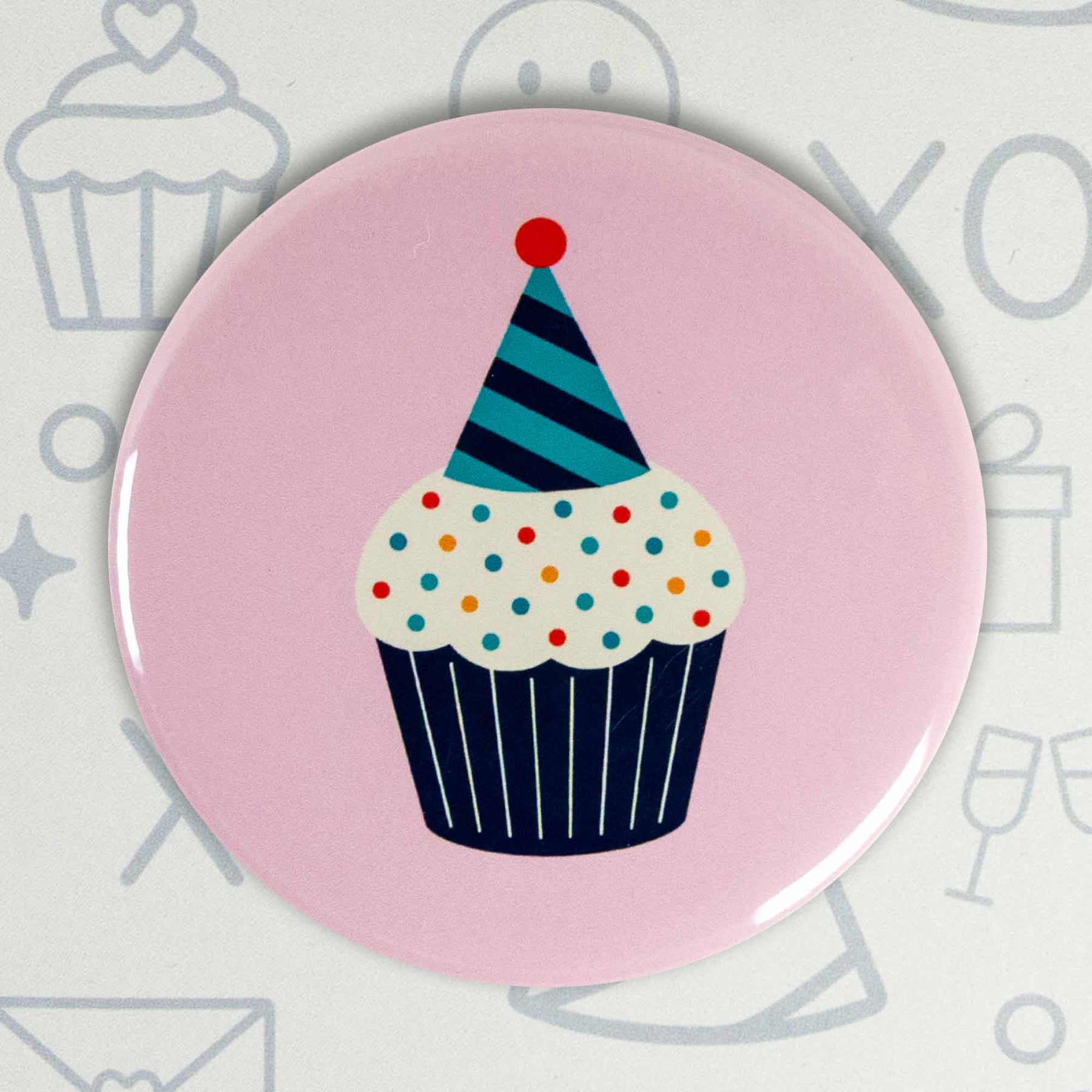 Featuring a playful cupcake topped with sprinkles and a striped party hat on a soft pink background, this design is perfect for birthdays, celebrations, or simply spreading a little joy. Whether you wear it as a pinback button on your bag or jacket or display it as a magnet on your fridge or office board, it’s a small way to add a pop of fun to your day.