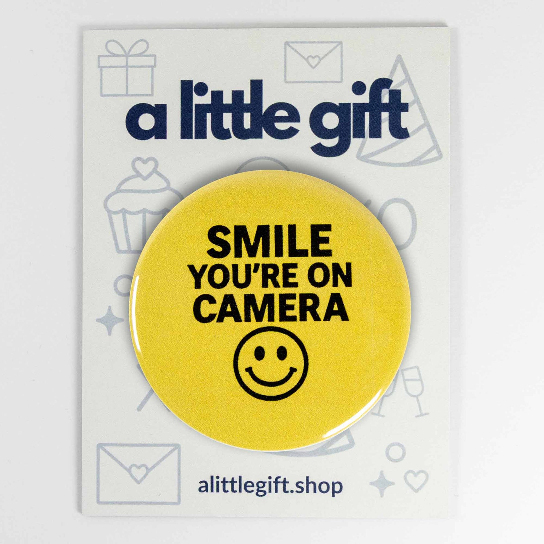 Add a cheeky reminder to stay on your best behavior with this “Smile You’re on Camera” Button or Magnet!