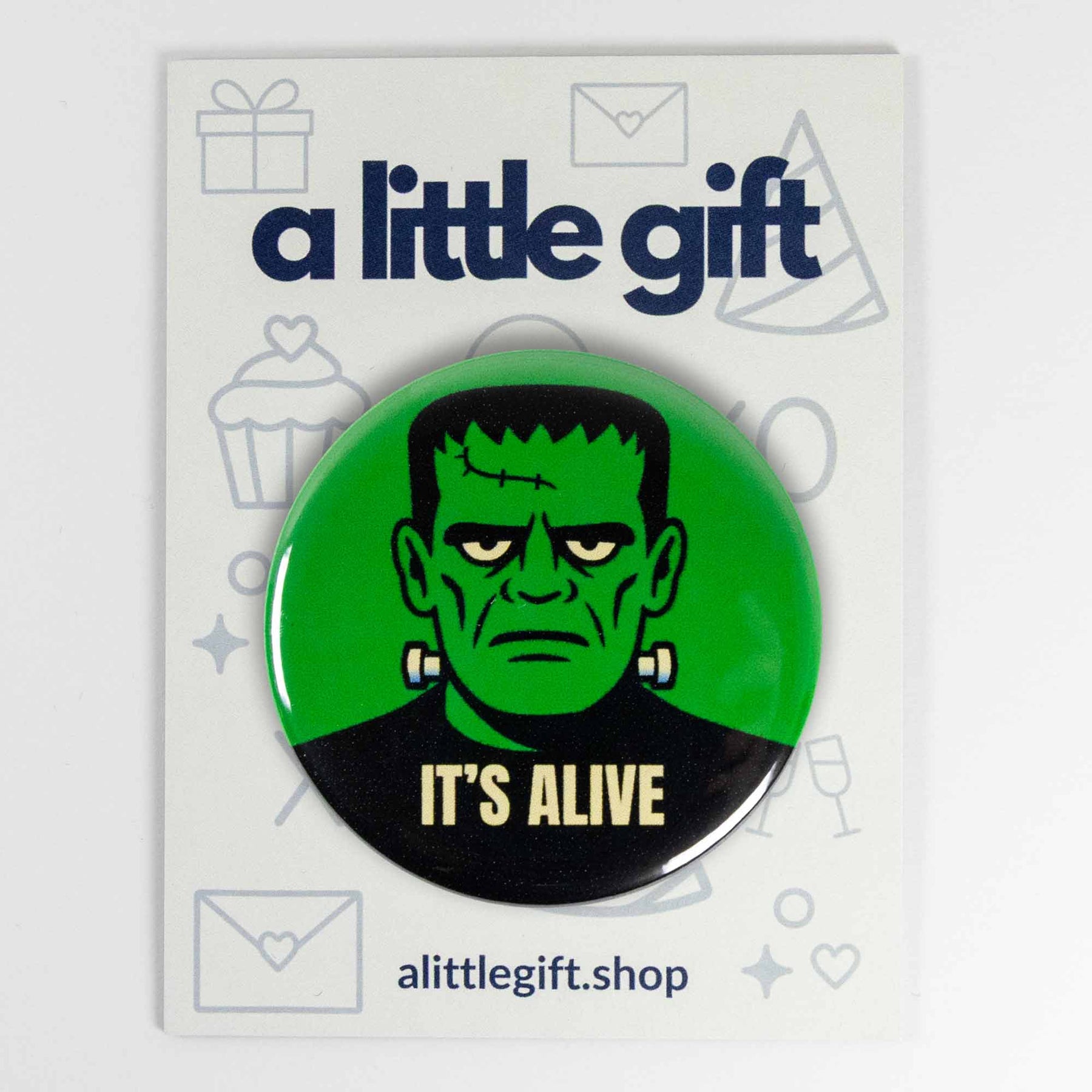 Bring classic monster vibes to life with this “It’s Alive” Frankenstein Button or Magnet.