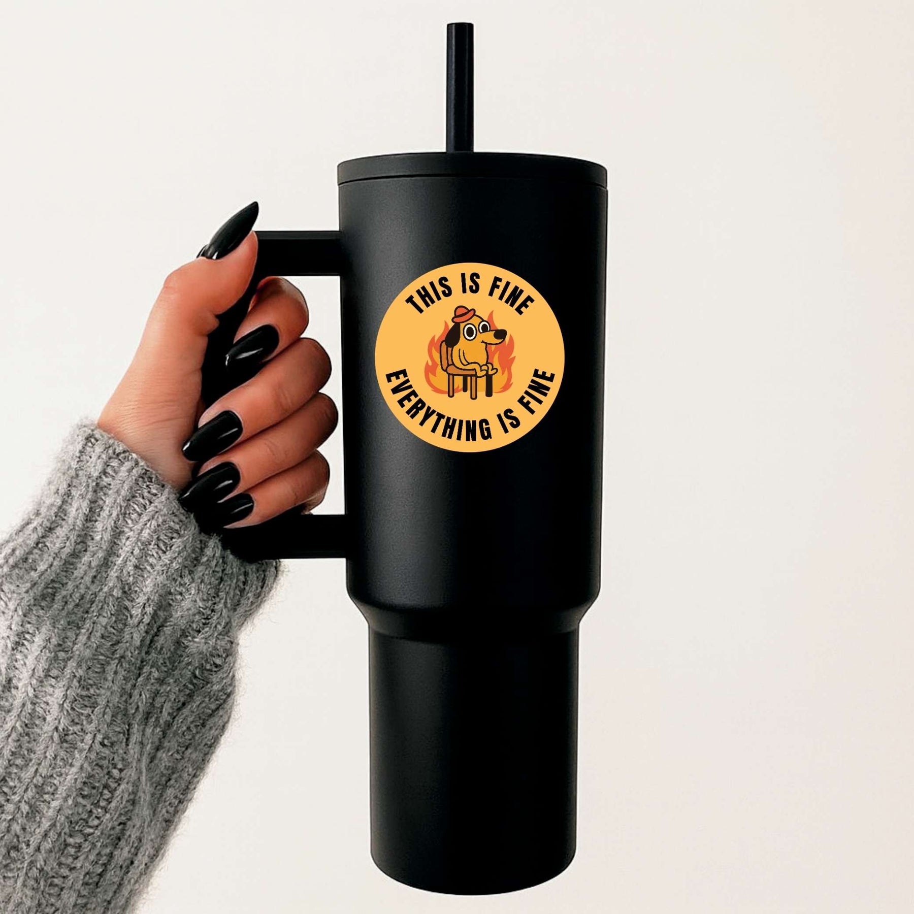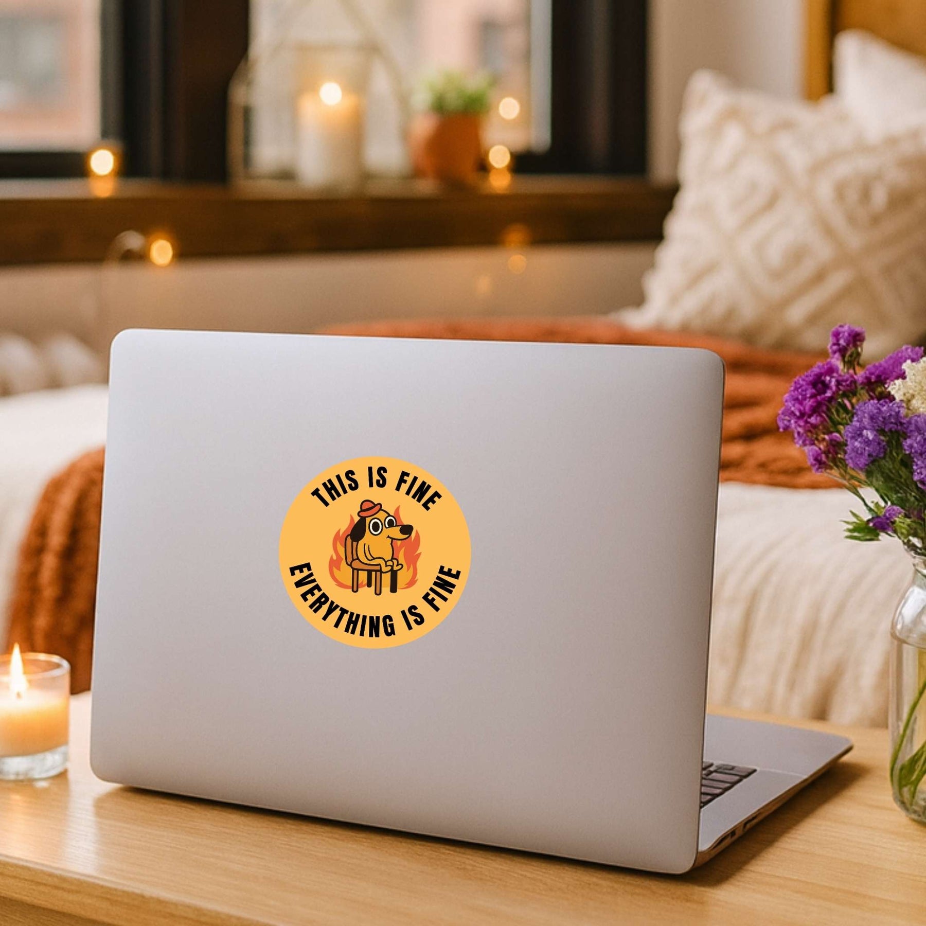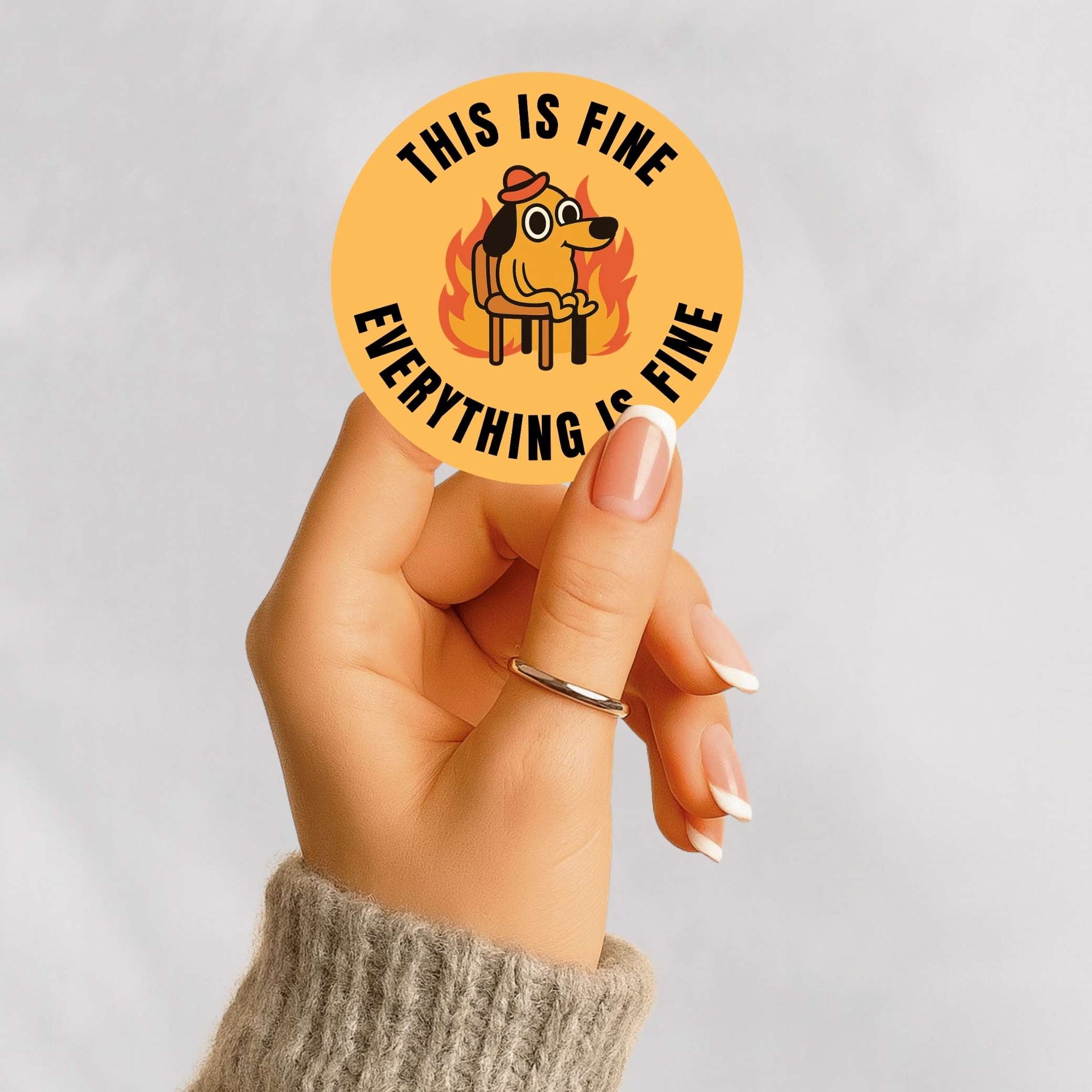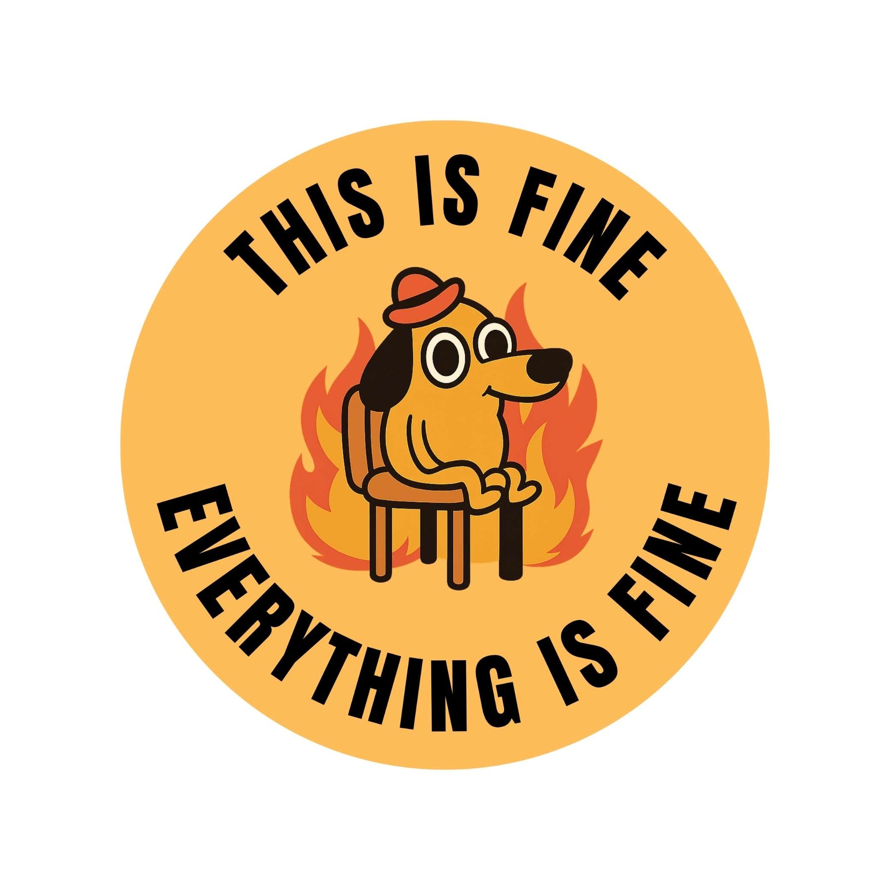 Stay calm in the chaos with the This Is Fine sticker, featuring the iconic dog surrounded by flames with the classic “Everything Is Fine” quote. A perfect mix of humor and relatability, this sticker captures those everyday moments when you’re just trying to hold it together with style.
