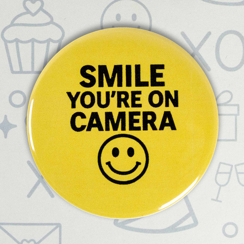 Smile You’re on Camera Button or Magnet – Funny Retro Yellow Smiley Face Design
