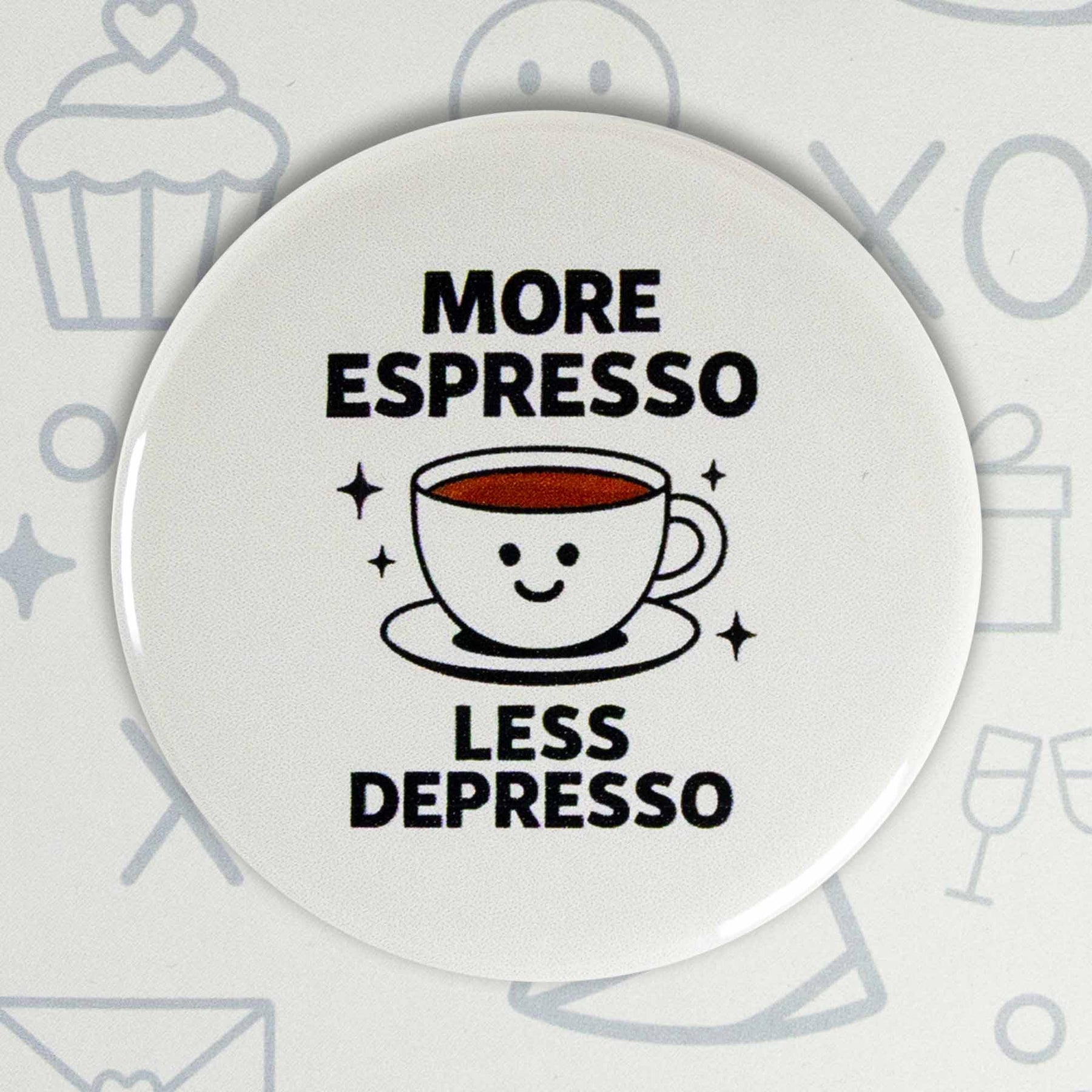 Start your day with a smile (and some caffeine) with this “More Espresso, Less Depresso” Button or Magnet.